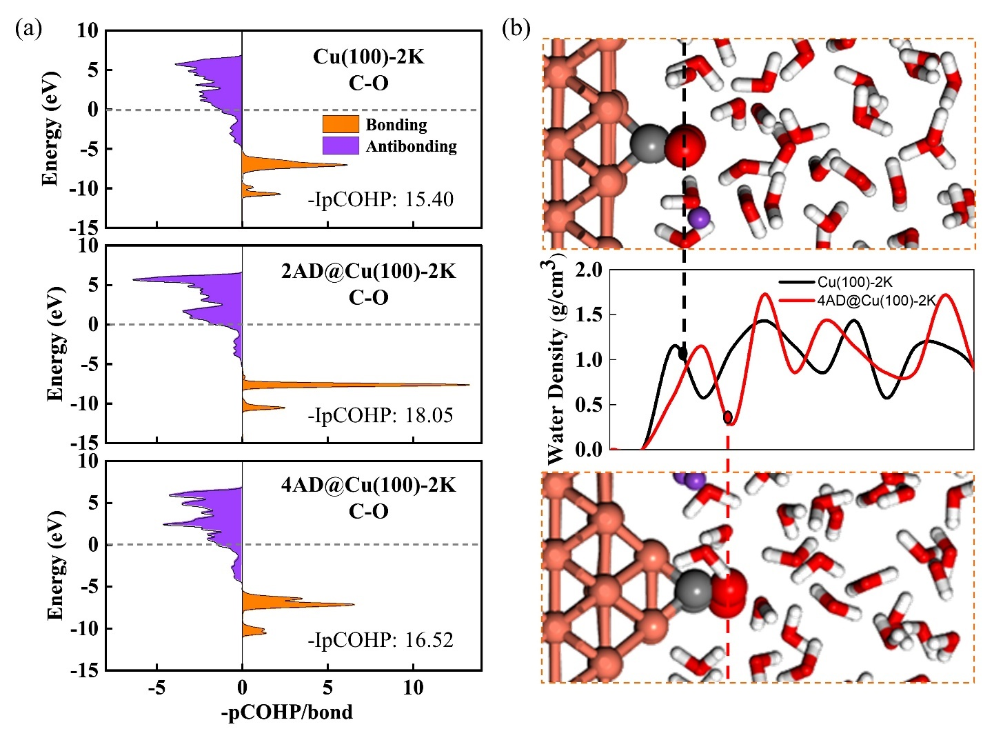4. 近一步的电子结构和几何结构分析表明,C-O键在2个K离子的4原子体系中键级和键能相较于对应的平面和2原子体系处于不强不弱的状态,这是由于重构的4原子结构顺利获得调控表界面水结构,使CO处于一个相对疏水的环境,从而使C-O键长活化到适中的状态以利于反应。
